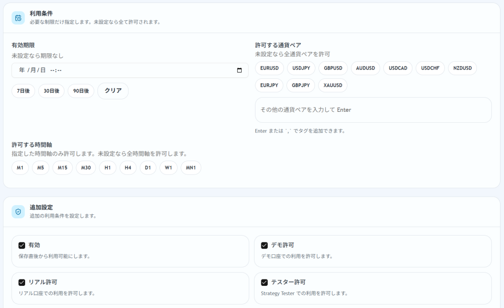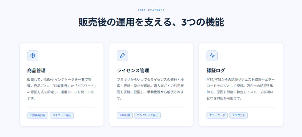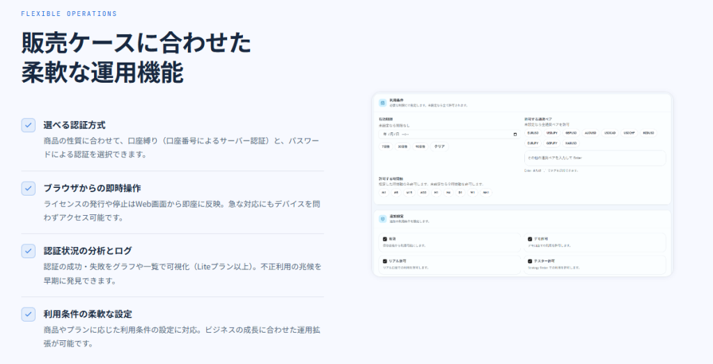 商品管理、ライセンス管理、認証ログという基本機能に加え、通貨ペア、時間軸、デモ/リアル口座制限のような条件を含めて運用設計しやすい点は、単なる口座認証サービス以上の価値があります。