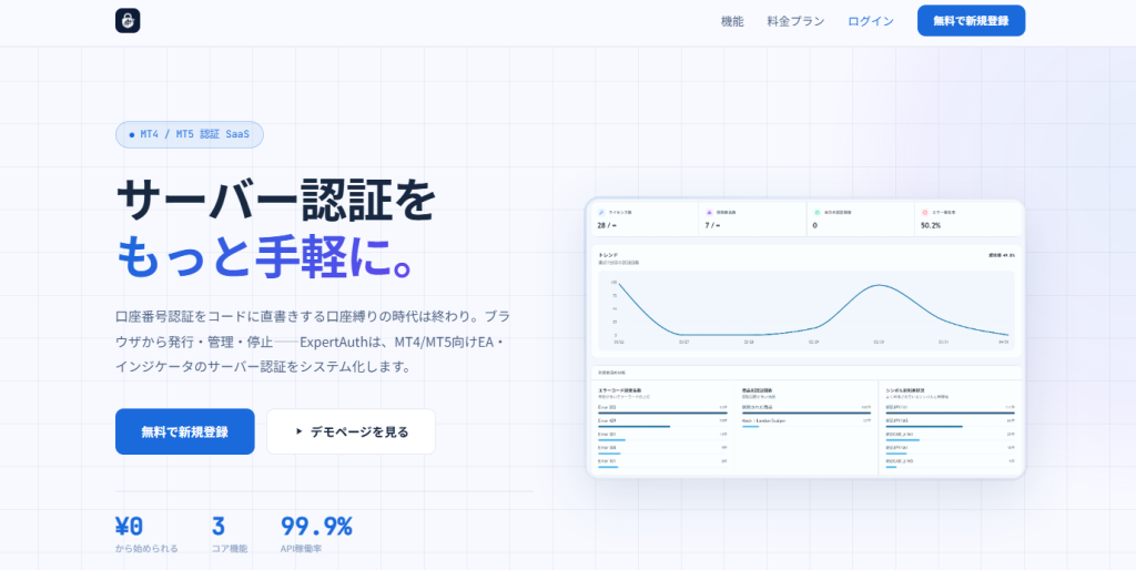 ExpertAuthは、MT4/MT5向けのEA・インジケーター認証に対応したサーバー認証SaaSです。