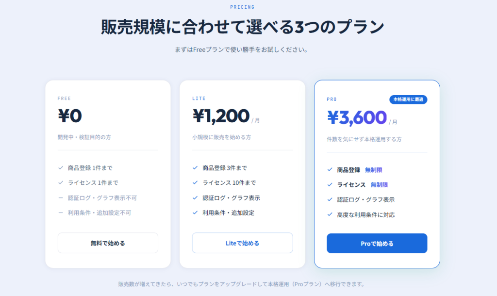 | ExpertAuth | 柔軟な利用条件設定が可能 | あり | 無料プランあり。Proは商品登録・ライセンスとも無制限 | 総合的にもっとも選びやすい |