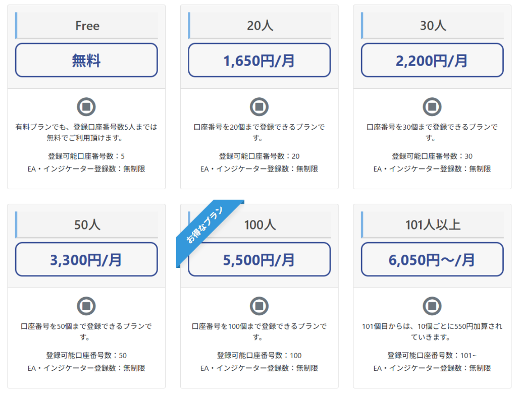 一方で、料金は登録可能口座番号数ベースで増えていく仕組みになっており、公式料金ページでは101個目からは10個ごとに550円加算されると案内されています。