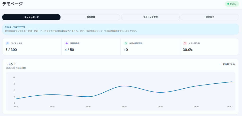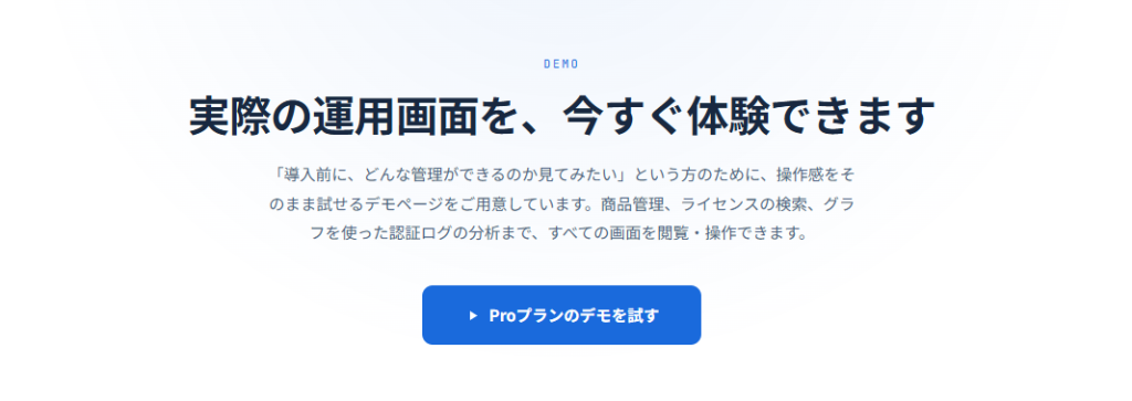 デモページで商品管理、ライセンス検索、認証ログ分析まで実際に操作でき、導入前に運用イメージを持ちやすくなっています。